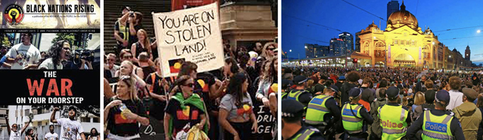 LEFT: So-called "Warriors of the Aboriginal Resistance" declare war on the Australians who provide them with their welfare benefits; CENTRE: This is what the Uluru Statement is all about, namely, the Aboriginal demand for ownership of the whole of the Australian land mass; RIGHT: Aboriginal protesters sit down across a major Melbourne city intersection to block people who actually work returning to their homes at the end of the day.