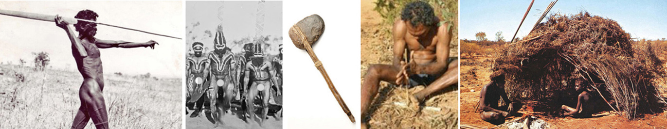 The British settlers found no Aboriginal towns or villages; no buildings of any kind or fences; no roads or even established paths; no knowledge of agriculture; no knowledge of writing; and no ability to create clothes, to build even a primitive hut for shelter, or create a bow and arrow to hunt for food. Hunting for food was usually carried out with a thrown spear as shown in the image below.