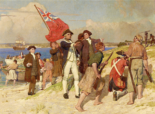 The British flag is raised in a formal ceremony in the presence of Governor Arthur Phillip at Sydney Cove on the evening of 26 January 1788. Those present are raising their glasses to toast the king and queen. Local Aborigines appeared to show little interest in the new arrivals. Painting by Algernon Talmage RA.